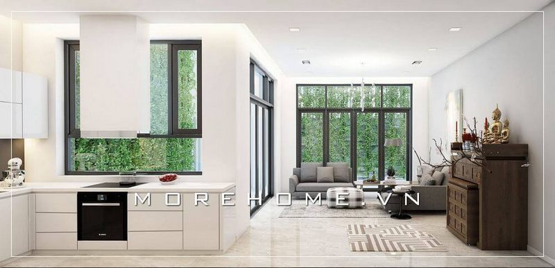Ngoài ra, việc tích hợp ánh sáng tự nhiên cũng là một yếu tố quan trọng trong thiết kế. Những cửa sổ lớn và giếng trời không chỉ tạo sự thoáng đãng mà còn làm nổi bật